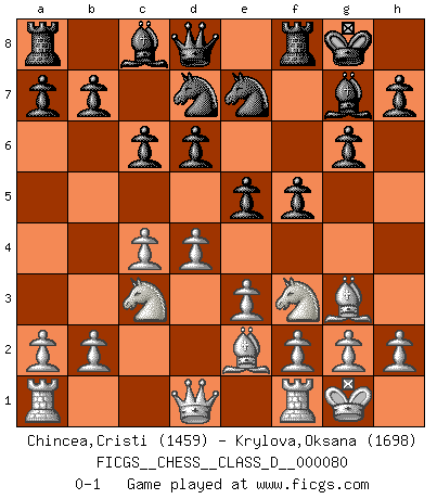 Last move : 0-1 2008 April 18 10:26:20 [Event "FICGS__CHESS__CLASS_D__000080"] [Site "FICGS"] [Date "2008.02.23"] [Round "1"] [White "Chincea,Cristi"] [Black "Krylova,Oksana"] [Result "0-1"] [WhiteElo "1459"] [BlackElo "1698"] 1.d4 g6 2.c4 Bg7 3.Nf3 d6 4.Bf4 Nd7 5.e3 c6 6.Be2 e5 7.Bg3 Ne7 8.O-O O-O 9.Nc3 f5 0-1 Modern defense Kingside Castling by player White (move 8) Kingside Castling by player Black (move 8) Player Black won this chess game. Follow this game move after move (download)The combination player thinks forward; he starts from the given position, and tries the forceful moves in his mind. (Emanuel Lasker) Mit Schach schule ich mein Gefühl für Geometrie, was für Tennis und Schach gleichermaßen wichtig ist. (Boris Becker) Un mal plan es mejor que no tener ningún plan. (Frank Marshall) L'attaque fait le spectacle, la défense gagne les matchs. (Dicton footballistique) Nobody is always a winner, and anybody who says he is, is either a liar or doesn't play poker. (Amarillo Slim)