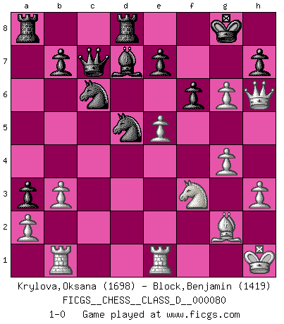 Last move : 1-0 2008 July 17 19:59:41 [Event "FICGS__CHESS__CLASS_D__000080"] [Site "FICGS"] [Date "2008.02.23"] [Round "1"] [White "Krylova,Oksana"] [Black "Block,Benjamin"] [Result "1-0"] [WhiteElo "1698"] [BlackElo "1419"] 1.e4 c5 2.Nc3 Nc6 3.g3 g6 4.Bg2 Bg7 5.Rb1 Nf6 6.d3 O-O 7.f4 d6 8.Nf3 Qb6 9.O-O Be6 10.h3 Nh5 11.Kh2 Bxc3 12.f5 Bd7 13.Bh6 Bg7 14.Qd2 Nf6 15.Bxg7 Kxg7 16.Rfe1 Qc7 17.c3 a5 18.g4 a4 19.Kh1 Kg8 20.Qh6 a3 21.b3 Ne5 22.Qe3 Rfd8 23.d4 cxd4 24.cxd4 Nc6 25.e5 Nd5 26.Qh6 dxe5 27.dxe5 f6 28.fxg6 1-0 Sicilian : Closed Kingside Castling by player Black (move 6) Kingside Castling by player White (move 9) Player White won this chess game. Follow this game move after move (download)I am the best player in the world and I am here to prove it. (Bobby Fischer) Schach ist ein Kampf gegen den Fehler. (Johannes Herrman Zukertort) Botvinnik trató de alejar el misterio referente al Ajedrez, siempre relacionandolo a situaciones de la vida diaria. Solía llamar al Ajedrez un problema inexacto típico, similar a aquellos en que la gente tiene siempre que resolver a cada día. (Garry Kasparov) Les réformistes prétendent que les progrès de la théorie conduiront à la disparition des échecs, et qu'il faut, pour leur rendre vie, en remanier les règles. En réalité, qu'exprime cette affirmation? Le mépris de l'intuition, de l'imagination et de tous les autres éléments qui font des échecs un art. (Alexander Alekhine) Luck is when opportunity knocks and you answer. (Anonymous)