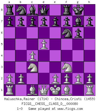 Last move : 1-0 2008 April 18 10:26:3 [Event "FICGS__CHESS__CLASS_D__000080"] [Site "FICGS"] [Date "2008.02.23"] [Round "1"] [White "Haluschka,Rainer"] [Black "Chincea,Cristi"] [Result "1-0"] [WhiteElo "1714"] [BlackElo "1459"] 1.d4 Nf6 2.c4 g6 3.Nf3 Bg7 4.d5 O-O 5.Nc3 1-0 King's Indian, 3.Nf3 Kingside Castling by player Black (move 4) Player White won this chess game. Follow this game move after move (download)Why must I lose to this idiot ? (Aron Nimzovich) Mutter, ich bin eben Ex-Weltmeister geworden. --beim nach Hause Kommen nach dem Verlust des WM-Titels an Mihail Botvinnik -- (Mikhail Nekhemyevich Tal) Es el objetivo de la escuela moderna no tratar cada posición de acuerdo a una regla general, sino de acuerdo al principio inherente en la posición. (Richard Reti) Il n'y a plus de joueurs du niveau de Jacob Murray dont la seule quête est le beau jeu, le plaisir de voir les pièces construire quelque chose. Sur 10 idées à la minute, 9 seront sans intérêt, la dernière s'avèrera géniale. (Christian Bauer) Never risk one's whole fortune unless supported by one's entire army. (Niccolo Machiavelli)