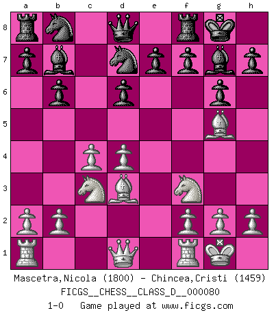 Last move : 1-0 2008 April 18 10:26:6 [Event "FICGS__CHESS__CLASS_D__000080"] [Site "FICGS"] [Date "2008.02.23"] [Round "1"] [White "Mascetra,Nicola"] [Black "Chincea,Cristi"] [Result "1-0"] [WhiteElo "1800"] [BlackElo "1459"] 1.d4 Nf6 2.c4 g6 3.Nf3 Bg7 4.Nc3 O-O 5.e4 d6 6.Bg5 b6 7.e5 Nfd7 8.exd6 cxd6 9.Bd3 Bb7 10.O-O 1-0 King's Indian, 3.Nf3 Kingside Castling by player Black (move 4) Kingside Castling by player White (move 10) Player White won this chess game. Follow this game move after move (download)No Chess Grandmaster is normal; they only differ in the extent of their madness. (Viktor Korchnoi) Dieses schreckliche Gefühl, dass ich gegen eine Maschine spielte, die niemals Fehler macht, zerschmetterte meinen Widerstand. (Mark Taimanov) Solo los afeminados hacen el Enroque. (Rob Sillars) On croit qu'il y a plus de mauvais joueurs que de bons joueurs, c'est faux : Il y a autant de joueurs qui gagnent que de joueurs qui perdent. (Philippe Geluck) The good fighters of old first put themselves beyond the possibility of defeat, and then waited for an opportunity of defeating the enemy. (Sun Tzu)