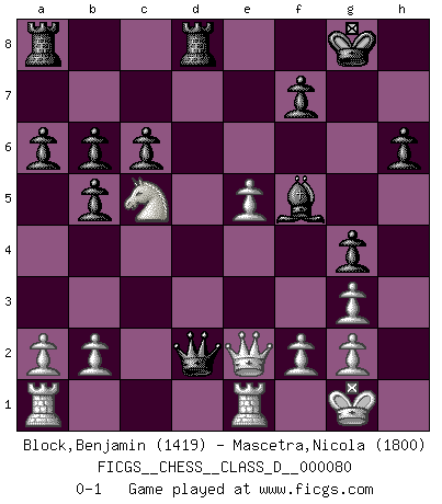 Last move : 0-1 2008 March 30 19:25:23 [Event "FICGS__CHESS__CLASS_D__000080"] [Site "FICGS"] [Date "2008.02.23"] [Round "1"] [White "Block,Benjamin"] [Black "Mascetra,Nicola"] [Result "0-1"] [WhiteElo "1419"] [BlackElo "1800"] 1.e4 e5 2.Nf3 Nc6 3.Bb5 Nf6 4.O-O Bc5 5.c3 O-O 6.d4 Bb6 7.Bg5 h6 8.Bh4 exd4 9.e5 g5 10.Bg3 Ne4 11.cxd4 Nxg3 12.hxg3 a6 13.Bxc6 dxc6 14.Qe2 g4 15.Nfd2 Qxd4 16.Nc4 Rd8 17.Nc3 Bf5 18.Nxb6 cxb6 19.Rfe1 Qd2 20.Na4 b5 21.Nc5 b6 0-1 Ruy Lopez : Berlin defense, Beverwijk variation Kingside Castling by player White (move 4) Kingside Castling by player Black (move 5) Player Black won this chess game. Follow this game move after move (download)Chess is a fairy tale of 1001 blunders. (Savielly Tartakower) Schach ist wie eine schöne Frau, zu der wir ständig zurückkehren, gleichviel, wie oft sie uns zurückweist. (Anonymous) La única cosa que los jugadores de Ajedrez tienen en común, es el Ajedrez. (Lodewijk Prins) Les Echecs mettent en conflit, non pas deux intelligences, mais deux volontés. (Lasker) Internal peace cannot coexist with external war. (Don Groves)