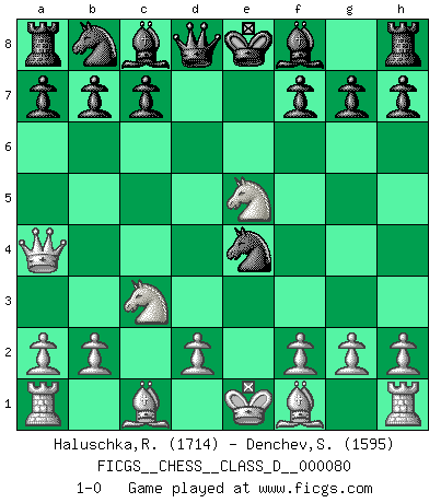 Last move : 1-0 2008 April 12 17:34:45 [Event "FICGS__CHESS__CLASS_D__000080"] [Site "FICGS"] [Date "2008.02.23"] [Round "1"] [White "Haluschka,Rainer"] [Black "Denchev,Stanimir"] [Result "1-0"] [WhiteElo "1714"] [BlackElo "1595"] 1.c4 d5 2.cxd5 Nf6 3.Nf3 Nxd5 4.e4 Nf6 5.Nc3 e5 6.Nxe5 Nxe4 7.Qa4+ 1-0 English Opening Player White won this chess game. Follow this game move after move (download)White lost because he failed to remember the right continuation and had to think up the moves himself. (Siegbert Tarrasch) Spiel ein langweiliges Spiel zu Ende und lustige Dinge können passieren. (Hans Ree) La mitad de las variaciones que son calculadas en una partida de torneo, resultan ser completamente superfluas. Desafortunadamente, nadie sabe por adelantado cual mitad. (Jan Tinman) Même si vous avez un bon coup à faire, regardez toujours s'il n'y en a pas un qui lui soit préférable. (Pedro Damiano) If only people were all showed a certain minimum level of niceness; if only people didn't retract verbal draw offers (without draw box ticked) on ficgs; if only people didn't kill; if only people didn't run concentration / extermination camps, if only people didn't drop nuclear bombs on Hiroshima and Nagasaki, and so on - it would be a much more beautiful world. But sadly, things are not so... (Normajean Yates)