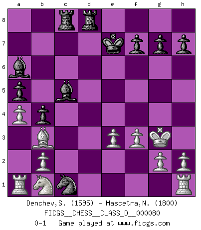 Last move : 0-1 2008 April 22 20:9:55 [Event "FICGS__CHESS__CLASS_D__000080"] [Site "FICGS"] [Date "2008.02.23"] [Round "1"] [White "Denchev,Stanimir"] [Black "Mascetra,Nicola"] [Result "0-1"] [WhiteElo "1595"] [BlackElo "1800"] 1.d4 d5 2.c4 Nf6 3.cxd5 c6 4.dxc6 Nxc6 5.Nf3 e5 6.dxe5 Qxd1+ 7.Kxd1 Ng4 8.Ke1 Bc5 9.e3 Ngxe5 10.Nxe5 Nxe5 11.Bb5+ Ke7 12.Bd2 Bf5 13.Ke2 a6 14.Ba4 Bd3+ 15.Ke1 b5 16.Bb3 b4 17.f3 Rhd8 18.a3 a5 19.a4 Rac8 20.Bc1 Ba6 21.Kf2 Nd3+ 22.Kg3 Nxc1 0-1 QGD : Marshall defense Player Black won this chess game. Follow this game move after move (download)By playing at Chess then, we may learn: First: Foresight... Second: Circumspection... Third: Caution... And lastly, we learn by Chess the habit of not being discouraged by present bad appearances in the state of our affairs, the habit of hoping for a favorable chance, and that of persevering in the secrets of resources. (Benjamin Franklin) Alle Schachspieler sollten auch ein Hobby haben. (Savielly Grigorievitsch Tartakower) El hombre es un frívolo, una creatura engañosa y como un jugador de Ajedrez, se preocupa mas por el proceso de obtener su meta que de la meta por sí misma. (Dostoyevsky) Nous vivons dans un monde échiquéen : chaque jour qui passe est un défi à relever. (Philosophe Sasha) Everybody lies. (Gregory House, House M.D.)