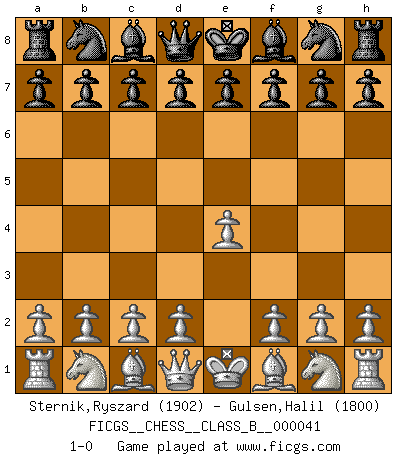 Last move : 1-0 2008 April 13 7:33:13 [Event "FICGS__CHESS__CLASS_B__000041"] [Site "FICGS"] [Date "2008.02.24"] [Round "1"] [White "Sternik,Ryszard"] [Black "Gulsen,Halil"] [Result "1-0"] [WhiteElo "1902"] [BlackElo "1800"] 1.e4 1-0 This chess game has been lost on time (started : 2008.02.24 19:20:9) King's pawn Opening Player White won this chess game. Follow this game move after move (download)War is the child of passion, passion is the child of narcissism and narcissism is the child. (...) Another game ? (Thibault de Vassal) Ich habe die besten Aussichten, den ersten Preis zu gewinnen - denn jeder muss gegen Steinitz spielen, nur ich nicht! (Wilhelm Steinitz) Yo creo que el Ajedrez posee una magia que es también una ayuda en la edad avanzada. Una rodilla reumática es olvidada durante una partida de Ajedrez y otros eventos pueden parecer algo sin importancia comparada a una catástrofe en el tablero de Ajedrez. (Vlastimil Hort) L'attaque fait le spectacle, la défense gagne les matchs. (Dicton footballistique) The faster the computer, the slower the brain. (Thibault de Vassal)
