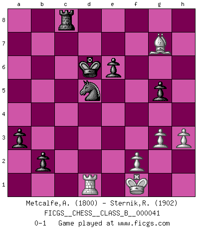 Last move : 0-1 2008 April 9 13:9:40 [Event "FICGS__CHESS__CLASS_B__000041"] [Site "FICGS"] [Date "2008.02.24"] [Round "1"] [White "Metcalfe,Allister"] [Black "Sternik,Ryszard"] [Result "0-1"] [WhiteElo "1800"] [BlackElo "1902"] 1.e4 e5 2.Nf3 Nc6 3.d4 exd4 4.Bc4 Bc5 5.c3 d3 6.Qxd3 d6 7.O-O Nf6 8.b4 Bb6 9.a4 a5 10.b5 Ne5 11.Nxe5 dxe5 12.Qxd8+ Kxd8 13.Bg5 Ke7 14.Nd2 h6 15.Bh4 Rd8 16.Nf3 Be6 17.Nxe5 g5 18.Bg3 Nxe4 19.Bxe6 fxe6 20.Nc4 Nxc3 21.Rfe1 Rd4 22.Nxb6 cxb6 23.h3 Rxa4 24.Bc7 Rxa1 25.Rxa1 a4 26.Bxb6 Nxb5 27.Rb1 Nc3 28.Ra1 Kd6 29.Kf1 Nd5 30.Bd4 a3 31.Bg7 b5 32.Bxh6 b4 33.g3 b3 34.Bg7 b2 35.Rd1 Rc8 0-1 Scotch gambit Kingside Castling by player White (move 7) Player Black won this chess game. Follow this game move after move (download)Chess is imagination. (David Bronstein) Wenn es im Universum noch irgendwo intelligente Lebewesen gibt, dann kennen sie Go. (Emanuel Lasker) Las leyes del Ajedrez no permiten una libre elección: tienes que mover quieras o no. (Emanuel Lasker) Avant la finale, les dieux ont créé le milieu de partie. (Tarrasch) Heh, heh, heh. Time to abandon ship. (General Grievous in Star Wars ep.3)