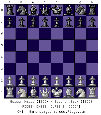 Last move : 0-1 2008 April 13 7:33:13 [Event "FICGS__CHESS__CLASS_B__000041"] [Site "FICGS"] [Date "2008.02.24"] [Round "1"] [White "Gulsen,Halil"] [Black "Stephen,Zack"] [Result "0-1"] [WhiteElo "1800"] [BlackElo "1800"] 0-1 This chess game has been lost on time (started : 2008.02.24 19:20:9) Player Black won this chess game. Follow this game move after move (download)Chess is thirty to forty percent psychology. You don't have this when you play a computer. I can't confuse it. (Judith Polgar) Du kannst im Schach nur gut werden, wenn du das Spiel liebst. (Robert James Fischer) El jugador blanco perdió porque fallo en recordar la coreccta continuación y tuvo que pensar por sí mismo las movidas. (Siegbert Tarrasch) Pour moi, les échecs ne sont pas un jeu mais un art. (Alexandre Alekhine) Wikichess, chess moves explained by 'experimented' players. (Thibault de Vassal)