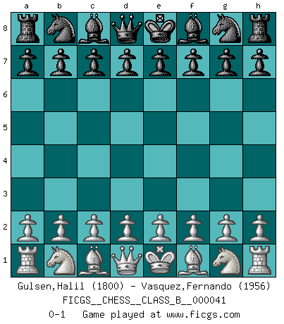 Last move : 0-1 2008 April 13 7:33:13 [Event "FICGS__CHESS__CLASS_B__000041"] [Site "FICGS"] [Date "2008.02.24"] [Round "1"] [White "Gulsen,Halil"] [Black "Vasquez,Fernando"] [Result "0-1"] [WhiteElo "1800"] [BlackElo "1956"] 0-1 This chess game has been lost on time (started : 2008.02.24 19:20:9) Player Black won this chess game. Follow this game move after move (download)The way he plays Chess demonstrates a man's whole nature. (Stanley Ellin) In der Schule lernt man nichts. Es ist nur Zeitverschwendung. (Robert James Fischer) Combinaciones deslumbrantes son para la mayoría, mover madera es para los pocos. (Georg Kieninger) Toutes choses étant égales, c'est la conviction qui gagne. Alliée à une volonté de vaincre, elle sert de détonateur, suscite des idées, disperse les doutes et aide à penser clairement. (Robert Fischer) Good luck. You're gonna need it. (Han Solo in Star Wars ep.6)