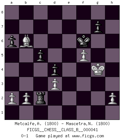 Last move : 0-1 2008 October 18 0:11:6 [Event "FICGS__CHESS__CLASS_B__000041"] [Site "FICGS"] [Date "2008.02.24"] [Round "1"] [White "Metcalfe,Allister"] [Black "Mascetra,Nicola"] [Result "0-1"] [WhiteElo "1800"] [BlackElo "1800"] 1.e4 e5 2.Nf3 Nc6 3.Bb5 a6 4.Bxc6 dxc6 5.O-O Bg4 6.d3 Qf6 7.Be3 Bxf3 8.Qxf3 Qxf3 9.gxf3 Bd6 10.Nd2 Ne7 11.Nc4 Ng6 12.Nxd6+ cxd6 13.Kg2 f5 14.exf5 Nh4+ 15.Kh3 Nxf5 16.f4 exf4 17.Bxf4 Kd7 18.Rfe1 Rhf8 19.Bg3 h5 20.f4 Nd4 21.Rac1 c5 22.Kh4 Nf3+ 23.Kxh5 Nxe1 24.Rxe1 Rf6 25.Re4 Re8 26.Kg4 Rfe6 27.Kf3 d5 28.Rxe6 Kxe6 29.Kg4 d4 30.f5+ Kf6 31.Bd6 b6 32.Bc7 Re2 33.Bxb6 Rxc2 0-1 Ruy Lopez : Exchange variation, 5.O-O Kingside Castling by player White (move 5) Player Black won this chess game. Follow this game move after move (download)He who takes the Queen's Knight's Pawn will sleep in the streets. (Anonymous) Die Neutralität betrachte ich als eine schwere Krankheit. (Viktor Kortschnoi) El arma más poderosa en el Ajedrez, es tener la próxima movida. (David Bronstein) Mais l'homme est une créature légère et illogique : semblable au joueur d'échecs, il n'aime que le processus du but à atteindre, non le but lui-même. (Dostoïevsky) The ego is not master in its own house. (Sigmund Freud)