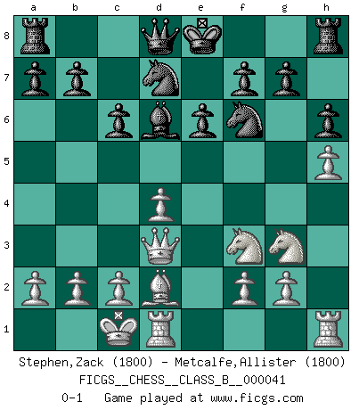 Last move : 0-1 2008 June 6 23:50:50 [Event "FICGS__CHESS__CLASS_B__000041"] [Site "FICGS"] [Date "2008.02.24"] [Round "1"] [White "Stephen,Zack"] [Black "Metcalfe,Allister"] [Result "0-1"] [WhiteElo "1800"] [BlackElo "1800"] 1.e4 c6 2.d4 d5 3.Nc3 dxe4 4.Nxe4 Bf5 5.Ng3 Bg6 6.h4 h6 7.Nf3 Nf6 8.h5 Bh7 9.Bd3 Bxd3 10.Qxd3 e6 11.Bd2 Bd6 12.O-O-O Nbd7 0-1 Caro-Kann : Classical, 6.h4 Queenside Castling by player White (move 12) Player Black won this chess game. Follow this game move after move (download)Is Bobby Fischer quite sane ? (Salo Flohr) Stil? Ich habe keinen Stil! (Anatoly Karpov) El Ajedrez tiene tanto misterio como las mujeres. (Purdy) Un millionnaire : 'Monsieur Steinitz ! Vous ne participez aux tournois que pour l'argent, alors que moi je n'y viens que pour l'honneur.' Steinitz : 'Chacun joue pour ce qu'il n'a pas'... Go and wake up your luck. (Persian saying)