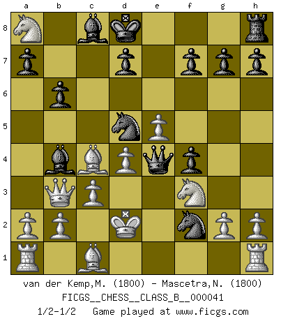 Last move : 1/2-1/2 2008 April 20 18:36:34 [Event "FICGS__CHESS__CLASS_B__000041"] [Site "FICGS"] [Date "2008.02.24"] [Round "1"] [White "van der Kemp,Michel"] [Black "Mascetra,Nicola"] [Result "1/2-1/2"] [WhiteElo "1800"] [BlackElo "1800"] 1.e4 e5 2.f4 exf4 3.Nc3 Qh4+ 4.Ke2 Nf6 5.Nf3 Qh5 6.d4 Nc6 7.e5 Ng4 8.Nd5 Nb4 9.Nxc7+ Kd8 10.Nxa8 Qg6 11.Qd2 b6 12.Qc3 Nd5 13.Qb3 Qe4+ 14.Kd2 Nf2 15.Bc4 Bb4+ 16.c3 Qe3+ 17.Kc2 Qe4+ 18.Kd2 Qe3+ 19.Kc2 Qe4+ 20.Kd2 1/2-1/2 KGA : Keres (Mason-Steinitz) gambit This chess game ended in a draw. Follow this game move after move (download)When the Chess game is over, the Pawn and the King go back to the same box. (Irish saying) Vielleicht wirkt die Aura früherer Spieler glanzvoller als die der heutigen Spieler, aber das liegt daran, dass man kein Programm wie Fritz hatte, das einem all die Löcher in ihren Partien zeigt. (Vladimir Kramnik) Las leyes del Ajedrez no permiten una libre elección: tienes que mover quieras o no. (Emanuel Lasker) Les erreurs sont comme les malheurs, elles n'arrivent jamais seules. (Siegbert Tarrasch) When you don't know what to do, walk fast and look worried. (Anonymous)