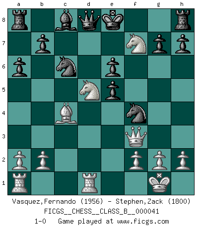 Last move : 1-0 2008 June 14 0:10:15 [Event "FICGS__CHESS__CLASS_B__000041"] [Site "FICGS"] [Date "2008.02.24"] [Round "1"] [White "Vasquez,Fernando"] [Black "Stephen,Zack"] [Result "1-0"] [WhiteElo "1956"] [BlackElo "1800"] 1.e4 c5 2.d4 cxd4 3.c3 dxc3 4.Nxc3 Nc6 5.Nf3 d6 6.Bc4 e6 7.O-O Be7 8.Qe2 a6 9.Bf4 Nf6 10.Rfd1 Qc7 11.e5 Nh5 12.Bg5 Bxg5 13.Nd5 Qd8 14.Nxg5 Nf4 15.Qf3 dxe5 16.Nxf7 1-0 Sicilian : Smith-Morra gambit Kingside Castling by player White (move 7) Player White won this chess game. Follow this game move after move (download)Bobby Fischer's current state of mind is indeed a tragedy. One of the world's greatest Chess players - the pride and sorrow of American Chess. (Frank Brady) Woher wissen wir, daß der Neanderthaler Blindschach gespielt hat? -- Bei Ausgrabungen wurden keine Schachbretter und Figuren gefunden. (Anonymous) Nunca nadie ha ganado una partida de Ajedrez rindiendose. (Unknown) Nous vivons dans un monde échiquéen : chaque jour qui passe est un défi à relever. (Philosophe Sasha) Art is not a thing, it is a way. (Elbert Hubbard)