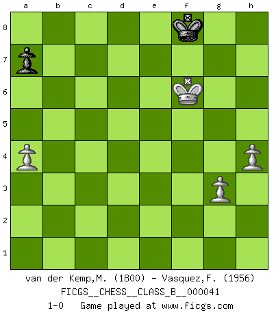 Last move : 1-0 2008 June 10 2:0:3 [Event "FICGS__CHESS__CLASS_B__000041"] [Site "FICGS"] [Date "2008.02.24"] [Round "1"] [White "van der Kemp,Michel"] [Black "Vasquez,Fernando"] [Result "1-0"] [WhiteElo "1800"] [BlackElo "1956"] 1.e4 e5 2.f4 exf4 3.Nf3 d6 4.d4 g5 5.h4 g4 6.Ng1 Qf6 7.Nc3 Ne7 8.Nge2 Bh6 9.Qd2 Nbc6 10.Nb5 O-O 11.Nxc7 Rb8 12.Nxf4 Nxd4 13.c3 Ne6 14.Ncxe6 fxe6 15.Qxd6 Bxf4 16.Bxf4 Qxf4 17.Qxe7 Qf2+ 18.Kd1 h6 19.Be2 Bd7 20.Rf1 Ba4+ 21.b3 Rbd8+ 22.Kc1 Qe3+ 23.Kb2 Qxe2+ 24.Ka3 Rxf1 25.Rxf1 Qxf1 26.Qxd8+ Qf8+ 27.Qxf8+ Kxf8 28.Kxa4 Kf7 29.Kb5 Kf6 30.c4 Ke5 31.c5 Kxe4 32.Kc4 Ke5 33.b4 Kf4 34.b5 Ke5 35.g3 Kf6 36.c6 bxc6 37.bxc6 Ke7 38.Kc5 h5 39.a4 e5 40.Kd5 Kd8 41.Kxe5 Kc7 42.Kf5 Kxc6 43.Kg5 Kd6 44.Kxh5 Ke7 45.Kxg4 Kf7 46.Kf5 Kf8 47.Kf6 1-0 KGA : Fischer defense Kingside Castling by player Black (move 10) 10 pieces endgame at move 37 : White KPPPP , Black KPPPP WHITE : King + 4 Pawns BLACK : King + 4 Pawns 9 pieces endgame at move 41 : White KPPPP , Black KPPP WHITE : King + 4 Pawns BLACK : King + 3 Pawns 8 pieces endgame at move 42 : White KPPP , Black KPPP WHITE : King + 3 Pawns BLACK : King + 3 Pawns 7 pieces endgame at move 44 : White KPPP , Black KPP WHITE : King + 3 Pawns BLACK : King + 2 Pawns 6 pieces endgame at move 45 : White KPPP , Black KP WHITE : King + 3 Pawns BLACK : King + 1 Pawn Player White won this chess game. Follow this game move after move (download)A good sacrifice is one that is not necessarily sound but leaves your opponent dazed and confused. (Rudolph Spielmann) Wenn ein Kopf und ein Buch zusammenstoßen und es klingt hohl, ist es denn allemal im Buche? (Georg Christoph Lichtenberg) El Ajedrez es el arte del análisis. (Mikhail Botvinnik) L'attaque fait le spectacle, la défense gagne les matchs. (Dicton footballistique) It's not enough to succeed. Others must fail. (Gore Vidal)