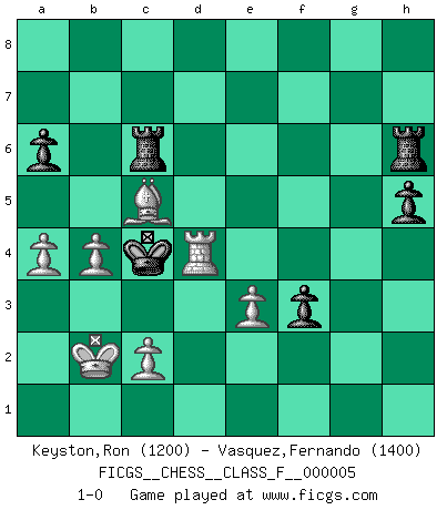 Last move : 1-0 2006 October 7 14:55:0 [Event "FICGS__CHESS__CLASS_F__000005"] [Site "FICGS"] [Date "2006.07.06"] [Round "1"] [White "Keyston,Ron"] [Black "Vasquez,Fernando"] [Result "1-0"] [WhiteElo "1200"] [BlackElo "1400"] 1.e4 e5 2.Nf3 d6 3.Nc3 Nc6 4.d4 Bg4 5.Bb5 exd4 6.Qxd4 Bxf3 7.gxf3 Nge7 8.Bg5 a6 9.Bxc6+ Nxc6 10.Qe3 f6 11.Bf4 g5 12.Bg3 h5 13.h4 Be7 14.O-O-O Qd7 15.hxg5 fxg5 16.e5 Qe6 17.exd6 Qxe3+ 18.fxe3 cxd6 19.Bxd6 Bf6 20.Ne4 Kf7 21.Rd5 Rae8 22.Bc5 Kg6 23.Nxf6 Kxf6 24.Rd6+ Kf7 25.Rd7+ Ke6 26.Rxb7 Kd5 27.b4 Kc4 28.Rc7 Rh6 29.a4 R8e6 30.Rd1 g4 31.Kb2 gxf3 32.Rxc6 Rxc6 33.Rd4+ 1-0 Philidor's defense Queenside Castling by player White (move 14) Player White won this chess game. Follow this game move after move (download)Fischer, who may or may not be mad as a hatter, has every right to be horrified. (Jeremy Silman) Die Leute spielen gegen mich seit 15 Jahren unter Ihren Möglichkeiten. (Robert James Fischer) Yo no le temo a Spassky. Todos saben que yo soy el mejor. Uno no necesita un torneo para probarlo. (Bobby Fischer) Les échecs, c'est l'art d'analyser. (Mikhail Botvinnik) Memory is a crazy woman that hoards colored rags and throws away food. (Austin O'Malley)