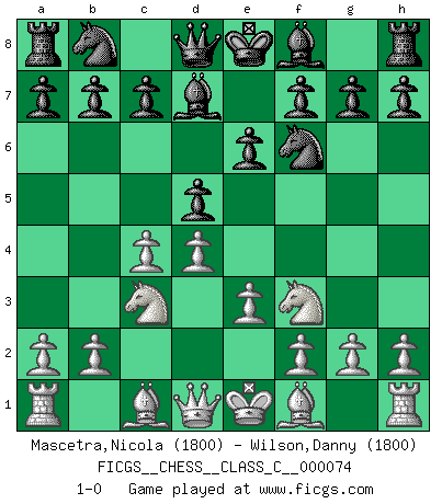 Last move : 1-0 2008 April 17 7:52:17 [Event "FICGS__CHESS__CLASS_C__000074"] [Site "FICGS"] [Date "2008.02.25"] [Round "1"] [White "Mascetra,Nicola"] [Black "Wilson,Danny"] [Result "1-0"] [WhiteElo "1800"] [BlackElo "1800"] 1.d4 d5 2.c4 e6 3.Nf3 Nf6 4.e3 Bd7 5.Nc3 1-0 This chess game has been lost on time (started : 2008.02.25 14:28:35) Queen's gambit declined Player White won this chess game. Follow this game move after move (download)I play correspondence chess because it is both art and science while chess is art only. (A player at FICGS) Die Jungen erwarten, dass Opa einfach umfällt. Dann aber kann Opa fünf Stunden lang Schach spielen und die jungen Gegner an die Wand drücken. (Viktor Kortschnoi) Yo adoro todas la posiciones. Denme una partida posicional difícil, y la jugaré. Pero posiciones totalmente ganadas, no las tolero. (Hein Donner) Ce qui est bien, c'est d'avoir tout un tas de pièces en prise : l'adversaire ne peut en prendre qu'une à la fois. Cité par Thierry Audin. Hardware: the parts of a computer that can be kicked. (Jeff Persis)