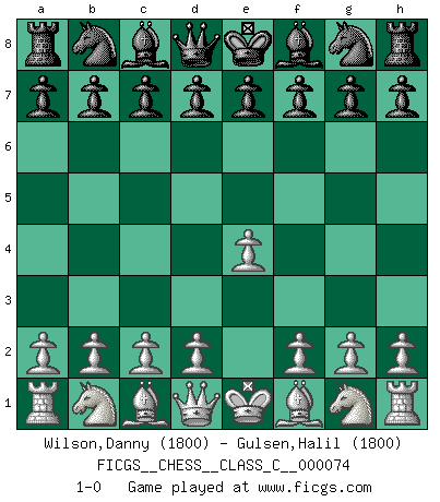 Last move : 1-0 2008 April 13 7:33:13 [Event "FICGS__CHESS__CLASS_C__000074"] [Site "FICGS"] [Date "2008.02.25"] [Round "1"] [White "Wilson,Danny"] [Black "Gulsen,Halil"] [Result "1-0"] [WhiteElo "1800"] [BlackElo "1800"] 1.e4 1-0 This chess game has been lost on time (started : 2008.02.25 14:28:35) King's pawn Opening Player White won this chess game. Follow this game move after move (download)It is always better to sacrifice your opponent's men. (Savielly Tartakower) Er war ein guter Schachspieler, aber ich kann Leute nicht ausstehen, die 'Heil Hitler' rufen (Über Alexander Aljechin). (Miguel Najdorf) El Ajedrez es el juego mas altamente simbólico, pero las agresiones estan por lo tanto aún mas francamente representadas en la partida. Tal vez comenzo como un juego de guerra; Algo como la representación de una batalla en miniatura entre las fuerzas de dos reinos. (Karl Meninger) Votre prénom est 'Tactique', votre deuxième prénom est 'Tactique' et votre nom est 'Tactique'. (Ken Smith) Ah, the Socrating method. The best way we have of teaching everything-apart from juggling chainsaws. (Gregory House, House M.D.)