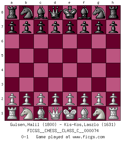 Last move : 0-1 2008 April 13 7:33:13 [Event "FICGS__CHESS__CLASS_C__000074"] [Site "FICGS"] [Date "2008.02.25"] [Round "1"] [White "Gulsen,Halil"] [Black "Kis-Kos,Laszlo"] [Result "0-1"] [WhiteElo "1800"] [BlackElo "1631"] 0-1 This chess game has been lost on time (started : 2008.02.25 14:28:35) Player Black won this chess game. Follow this game move after move (download)Fischer sacrificed virtually everything most of us weakies (to use his term) value, respect, and cherish, for the sake of an artful, often beautiful board game, for the ambivalent privilege of being its greatest master. (Paul Kollar) Wie gewinnt Tal? Er entwickelt alle seine Figuren in die Brettmitte und opfert sie dann irgendwo. (Robert James Fischer) No volvere nunca a jugar contigo. Has insultado a mi amigo. - cuando un oponente se maldijo por una mala jugada (Miguel Najdorf) Je menace de comprendre la position. (Anonyme) Do you know these so called Volunteers don't even get paid! (Simpsons)