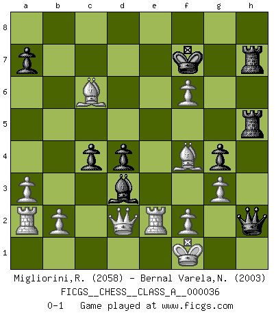 Last move : 0-1 2008 June 29 20:45:23 [Event "FICGS__CHESS__CLASS_A__000036"] [Site "FICGS"] [Date "2008.02.25"] [Round "1"] [White "Migliorini,Roberto"] [Black "Bernal Varela,Nelson"] [Result "0-1"] [WhiteElo "2058"] [BlackElo "2003"] 1.Nf3 Nf6 2.c4 e6 3.Nc3 Bb4 4.Qc2 O-O 5.a3 Bxc3 6.Qxc3 b6 7.g3 Bb7 8.Bg2 d5 9.cxd5 exd5 10.O-O Re8 11.Re1 c5 12.d4 Ne4 13.Qc2 Nc6 14.dxc5 bxc5 15.Be3 d4 16.Bf4 g5 17.Bc1 Qf6 18.Rf1 Rab8 19.h4 h6 20.hxg5 hxg5 21.Nh2 Qg6 22.Nf3 Kg7 23.Nd2 Nxd2 24.Qxd2 Re5 25.e4 Ba6 26.Re1 g4 27.Qf4 Rb3 28.Qd2 Bd3 29.Qd1 c4 30.Ra2 Rh5 31.Bf4 f6 32.Qd2 Rh7 33.e5 Qh5 34.exf6+ Kf7 35.Re2 Rb5 36.Bxc6 Qh2+ 37.Kf1 Rbh5 0-1 Reti Opening Kingside Castling by player Black (move 4) Kingside Castling by player White (move 10) Player Black won this chess game. Follow this game move after move (download)Spassky will not be psyched out by Fischer. (Mike Goodall) Heutzutage gewinnt im Turnier nicht derjenige Spieler, der weitreichende Pläne entwirft, sondern einfach jener, der Zug um Zug kämpft. (David Bronstein) La última cosa en que Fischer estaba interesado era en tonterías, siempre y cuando el Ajedrez estuviera involucrado. (Elie Agur) On entre au jeu d'Echecs comme on entre en Religion. Pour le joueur d'Echecs, la partie d'Echecs c'est l'office, la messe, le défilé du 1er Mai, le dépôt de gerbe au Monument aux Morts. C'est un drame sacré. (Michel Roos) Vladimir Ras-Putin is still alive... He is also a good actor, I saw him in the Lord of the Rings. (Rodolfo d'Ettorre)