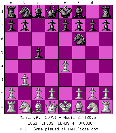Last move : 0-1 2008 March 5 15:47:14 [Event "FICGS__CHESS__CLASS_A__000036"] [Site "FICGS"] [Date "2008.02.25"] [Round "1"] [White "Minkin,Alexander"] [Black "Musil,Stanislav"] [Result "0-1"] [WhiteElo "2079"] [BlackElo "2075"] 1.e4 c5 2.b3 Nf6 0-1 Sicilian defense Player Black won this chess game. Follow this game move after move (download)No other master has such a terrific will to win. At the board he radiates danger, and even the strongest opponents tend to freeze, like rabbits when they smell a panther. Even his weaknesses are dangerous. As white, his opening game is predictable - you can make plans against it - but so strong that your plans almost never work. In the middle game his precision and invention are fabulous, and in the end game you simply cannot beat him. (Anonymous German Expert) Ein Buch ist ein Spiegel; wenn ein Affe hineinsieht, so kann kein Apostel heraus gucken. (Georg Christoph Lichtenberg) Los errores estan ahí, esperando a que se cometan. (Savielly Tartakower) Vous savez, camarade Pachman, je n'éprouve pas de plaisir à être ministre, je jouerais plutôt aux échecs comme vous, ou alors ferais une révolution au Venezuela. (Che Guevara à Ludek Pachman, 'Checkmate in Prague', 1975) To send light into the darkness of men's hearts - such is the duty of the artist. (Schumann)