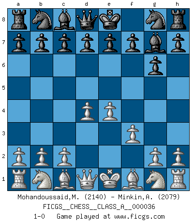 Last move : 1-0 2008 March 5 15:46:49 [Event "FICGS__CHESS__CLASS_A__000036"] [Site "FICGS"] [Date "2008.02.25"] [Round "1"] [White "Mohandoussaid,Malik"] [Black "Minkin,Alexander"] [Result "1-0"] [WhiteElo "2140"] [BlackElo "2079"] 1.d4 g6 2.e4 Bg7 3.f3 1-0 Modern defense Player White won this chess game. Follow this game move after move (download)It's always better to sacrifice your opponent's men. (Savielly Tartakover) Später, ... hatte ich zunehmend Erfolg in entscheidenden Partien. Vielleicht weil ich eine einfache Wahrheit erkannte: nicht nur ich hatte Angst, auch mein Gegner. (Mikhail Nekhemyevich Tal) En el Ajedrez, tal como en la vida, las bendiciones de hoy pueden ser el veneno del mañana. (Assaic) Si le désir cupide (et stupide) de gagner est une inépuisable source de souffrance, une combinaison brillante sur l'échiquier est une découverte : le coquelicot qui s'épanouit lorsque apparaît la Voie Lactée. (Arrabal) Gambling : The sure way of getting nothing from something. (Wilson Mizner)