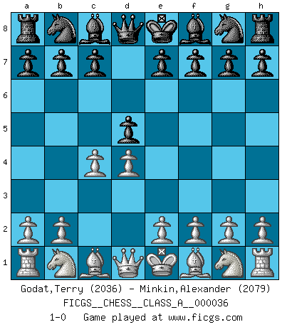 Last move : 1-0 2008 March 5 15:47:4 [Event "FICGS__CHESS__CLASS_A__000036"] [Site "FICGS"] [Date "2008.02.25"] [Round "1"] [White "Godat,Terry"] [Black "Minkin,Alexander"] [Result "1-0"] [WhiteElo "2036"] [BlackElo "2079"] 1.d4 d5 2.c4 1-0 Queen's Gambit Player White won this chess game. Follow this game move after move (download)Chess is 99 percent tactics. (Teichmann) Ich verlor meine Bürgerrechte, mein Gehalt wurde mir nicht mehr bezahlt und ich wurde zensiert und durfte nicht mehr ins Ausland reisen. [nach dem Match Fischer-Taimanov 6:0] (Mark Taimanov) Me gusta decir que Bobby Fischer fue el mejor jugador que jamás haya existido. Pero lo que hizo de Fischer un genio, fue su habilidad de mezclar una frescura y pragmatismo Americano con ideas Rusas acerca de la estrategia. (Bruce Pandolfini) Je menace de comprendre la position. (Anonyme) Ah, beer! The cause of, and the solution to, all of life's problems. (Homer Simpson)