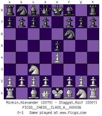 Last move : 0-1 2008 March 5 15:46:59 [Event "FICGS__CHESS__CLASS_A__000036"] [Site "FICGS"] [Date "2008.02.25"] [Round "1"] [White "Minkin,Alexander"] [Black "Staggat,Rolf"] [Result "0-1"] [WhiteElo "2079"] [BlackElo "2007"] 1.e4 e5 2.Nc3 Nf6 0-1 Vienna : Falkbeer variation Player Black won this chess game. Follow this game move after move (download)Chess is the art which expresses the science of logic. (Mikhail Botvinnik) Das Spiel gibt uns die Genugtuung, die das Leben uns versagt. (Emanuel Lasker) Te sientas frente a un tablero y repentinamente tu corazón brinca. Tu mano tiembla al tomar una pieza y moverla. Pero lo que el Ajedrez te enseña es que tu debes permanecer ahí con calma y pensar de que si realmente es una buena idea o de que si hay otras ideas mejores. (Stanley Kubrick) Aucun coup ne doit être joué sans but. (Pedro Damiano) The beginning is the most important part of the work. (Plato)