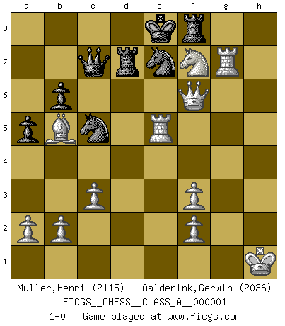 Last move : 1-0 2006 September 20 8:3:12 [Event "FICGS__CHESS__CLASS_A__000001"] [Site "FICGS"] [Date "2006.04.08"] [Round "1"] [White "Muller,Henri"] [Black "Aalderink,Gerwin"] [Result "1-0"] [WhiteElo "2115"] [BlackElo "2036"] 1.e4 c6 2.d4 d5 3.Nc3 dxe4 4.Nxe4 Nd7 5.Bc4 Ngf6 6.Ng5 e6 7.Qe2 Nb6 8.Bd3 h6 9.N5f3 c5 10.dxc5 Bxc5 11.Ne5 Nbd7 12.Ngf3 Qc7 13.O-O O-O 14.Bf4 Bd6 15.Rfe1 Nc5 16.Rad1 b6 17.c3 Bb7 18.Bc2 Rfd8 19.Rd4 Nd5 20.Bxh6 gxh6 21.Rg4+ Kf8 22.Qd2 Ke7 23.Rg7 Rf8 24.Qxh6 a5 25.Bg6 Kd8 26.Bxf7 Ne7 27.Bxe6 Bxf3 28.Nf7+ Ke8 29.Bc4 Bxh2+ 30.Kh1 Rd8 31.Bb5+ Rd7 32.gxf3 Bf4 33.Qf6 Be5 34.Rxe5 1-0 This chess game has been lost on time (started : 2006.04.08 16:54:26) Caro-Kann : Steinitz variation Kingside Castling by player White (move 13) Kingside Castling by player Black (move 13) Player White won this chess game. Follow this game move after move (download)Chess is a beautiful mistress. (Bent Larsen) Ein bischen Romantik kann weder im Schach noch in der Liebe schaden. Also versuche ich mich ab und zu daran zu erinnern. (Nigel Short) Alekhine es un poeta que crea un trabajo de arte de algo que raramente inspiraría a otra persona a mandar una tarjeta postal. (Max Euwe) Si je n'étais pas joueur d'échecs, je serais le meilleur dans quelque chose d'autre. (Anatoli Karpov) The Internet is so big, so powerful and pointless that for some people it is a complete substitute for life. (Andrew Brown)
