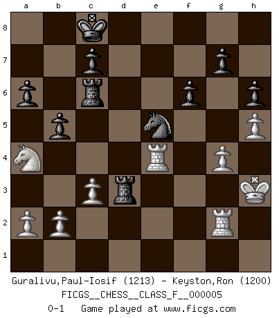 Last move : 0-1 2006 August 12 21:39:18 [Event "FICGS__CHESS__CLASS_F__000005"] [Site "FICGS"] [Date "2006.07.06"] [Round "1"] [White "Guralivu,Paul-Iosif"] [Black "Keyston,Ron"] [Result "0-1"] [WhiteElo "1213"] [BlackElo "1200"] 1.e4 d5 2.exd5 Qxd5 3.Nc3 Qd6 4.Nf3 Nf6 5.d4 a6 6.g3 Bg4 7.Bg2 Nc6 8.O-O O-O-O 9.Be3 e5 10.dxe5 Nxe5 11.Qxd6 Nxf3+ 12.Bxf3 Bxd6 13.Bxg4+ Nxg4 14.Bd4 f6 15.Rae1 Bxg3 16.fxg3 Rxd4 17.Re7 Rd7 18.Re4 Ne5 19.g4 h6 20.h4 Ng6 21.h5 Ne5 22.Rf2 Rhd8 23.Rg2 Rd6 24.Kh2 Rb6 25.Na4 Rc6 26.c3 b5 27.Kh3 Rd3+ 0-1 Scandinavian : Pytel-Wade variation Kingside Castling by player White (move 8) Queenside Castling by player Black (move 8) Player Black won this chess game. Follow this game move after move (download)The boy (then a 12 year old boy named Anatoly Karpov) doesn't have a clue about Chess, and there's no future at all for him in this profession. (Mikhail Botvinnik) Wenn ein Kopf und ein Buch zusammenstoßen und es klingt hohl, ist es denn allemal im Buche? (Georg Christoph Lichtenberg) El Ajedrez es el arte del análisis. (Mikhail Botvinnik) Vous savez, camarade Pachman, je n'éprouve pas de plaisir à être ministre, je jouerais plutôt aux échecs comme vous, ou alors ferais une révolution au Venezuela. (Che Guevara à Ludek Pachman, 'Checkmate in Prague', 1975) The Internet is the first thing that humanity has build that humanity doesn't understand, the largest experiment in anarchy that we have ever had. (Eric Schmidt)