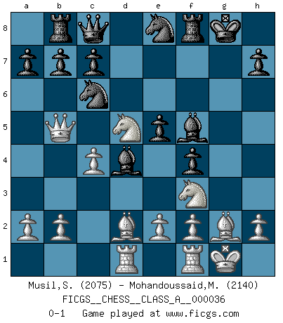 Last move : 0-1 2008 July 21 3:41:33 [Event "FICGS__CHESS__CLASS_A__000036"] [Site "FICGS"] [Date "2008.02.25"] [Round "1"] [White "Musil,Stanislav"] [Black "Mohandoussaid,Malik"] [Result "0-1"] [WhiteElo "2075"] [BlackElo "2140"] 1.c4 e5 2.Nc3 Nf6 3.g3 Nc6 4.Nf3 Be7 5.Bg2 O-O 6.d3 d6 7.O-O Ne8 8.Be3 f5 9.Qc2 f4 10.Bd2 g5 11.gxf4 gxf4 12.d4 Bf5 13.Qb3 Rb8 14.dxe5 dxe5 15.Rad1 Qc8 16.Nd5 Bc5 17.Qb5 Bd4 0-1 This chess game has been lost on time (started : 2008.02.25 15:38:11) English : Carls' Bremen system Kingside Castling by player Black (move 5) Kingside Castling by player White (move 7) Player Black won this chess game. Follow this game move after move (download)The older I grow, the more I value Pawns. (Keres) Die jungen Leute sollen verstehen, dass sie noch etwas von mir lernen können und müssen. (Viktor Kortschnoi) Mis oponentes también hacen buenas movidas. A veces yo no tomo esas cosas en consideración. (Bobby Fischer) Le joueur d'Echecs qui veut atteindre le top est obligé de développer son propre credo créatif. Alexeï Stepanovicth Souétine. Il est facile d'écrire des livres ! Ce qui est difficile, c'est de jouer ! (Alexeï Stepanovicth Souétine) Life is pain my dear and anyone who says otherwise is selling something. (Princess Bride)