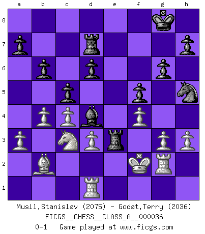 Last move : 0-1 2008 July 20 15:38:55 [Event "FICGS__CHESS__CLASS_A__000036"] [Site "FICGS"] [Date "2008.02.25"] [Round "1"] [White "Musil,Stanislav"] [Black "Godat,Terry"] [Result "0-1"] [WhiteElo "2075"] [BlackElo "2036"] 1.c4 g6 2.Nc3 Bg7 3.Nf3 c5 4.g3 Nc6 5.Bg2 e5 6.O-O Nge7 7.a3 O-O 8.Ne1 d6 9.Nc2 Be6 10.Ne3 Qd7 11.d3 Bh3 12.Bxh3 Qxh3 13.f3 f5 14.Ned5 Nxd5 15.Nxd5 Rf7 16.Rf2 Raf8 17.Qf1 Qxf1+ 18.Kxf1 e4 19.Rb1 Ne5 20.f4 Ng4 21.Rg2 Re8 22.b4 b6 23.h3 Nf6 24.Nc3 Rd7 25.Bb2 exd3 26.exd3 Re3 27.Rd1 Nh5 28.Kf2 Bd4 0-1 English Opening Kingside Castling by player White (move 6) Kingside Castling by player Black (move 7) Player Black won this chess game. Follow this game move after move (download)There must have been a time when men were demigods, or they could not have invented Chess. (Gustav Schenk) Habe Mut, dich deines eigenen Verstandes zu bedienen. (Immanuel Kant) Coloca el contenido de las piezas del Ajedrez en un sombrero, agitalo vigorosamente, arrojalas en un tablero desde una altura de 30 centimetros y así obtendras el estilo de Steinitz. (H. E. Bird) Vous m'avez demandé de vous exposer quel est le fondement de la prière. Je ne fais que préparer les pièces du jeu sur la table... Nous sera-t-il permis d'en adopter les règles et si nous les appliquons scrupuleusement nous ne tarderons pas à faire mat le Roi divin ! Il ne pourra échapper à nos mains. (Sainte Thérèse d'Avila, Chemin de perfection) He who laughs last probably does not get the joke. (Unknown)