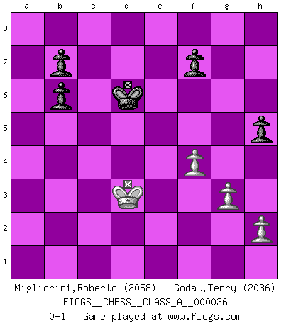 Last move : 0-1 2008 April 1 12:26:18 [Event "FICGS__CHESS__CLASS_A__000036"] [Site "FICGS"] [Date "2008.02.25"] [Round "1"] [White "Migliorini,Roberto"] [Black "Godat,Terry"] [Result "0-1"] [WhiteElo "2058"] [BlackElo "2036"] 1.d4 Nf6 2.Nf3 d5 3.Bf4 c5 4.e3 Nc6 5.c3 Qb6 6.Qb3 c4 7.Qxb6 axb6 8.Na3 Bf5 9.Nh4 Bd7 10.Be2 Ne4 11.Nb5 Ra5 12.Nc7+ Kd8 13.Nxd5 Rxd5 14.Bxc4 Ra5 15.Bd3 Nxc3 16.bxc3 g5 17.Bxg5 Rxg5 18.g3 Bg7 19.Kd2 Kc7 20.Rhb1 Rh5 21.Rb2 Bf6 22.Be2 Ra5 23.Ng2 e5 24.f4 exd4 25.exd4 Nxd4 26.cxd4 Bxd4 27.Rc2+ Kb8 28.Rb1 Rd8 29.Bd3 Ba4 30.R2c1 Bc6 31.Ne3 Rxa2+ 32.Rc2 Bxe3+ 33.Kxe3 Rxd3+ 34.Kxd3 Rxc2 35.Kxc2 Be4+ 36.Kc1 Bxb1 37.Kxb1 h5 38.Kc2 Kc7 39.Kd3 Kd6 0-1 Queen's pawn game 10 pieces endgame at move 36 : White KPPP , Black KBPPPP WHITE : King + 3 Pawns BLACK : King + 1 Bishop 4 Pawns 9 pieces endgame at move 37 : White KPPP , Black KPPPP WHITE : King + 3 Pawns BLACK : King + 4 Pawns Player Black won this chess game. Follow this game move after move (download)You need not play well - just help your opponent to play badly. (Genrikh Chepukaitis) Ich habe kein Problem mit Frauen, sondern nur mit dem Niveau ihres Schachspiels (Judith Polgar) Creo que una cierta cantidad de temperamento es esperada de los genios del Ajedrez. (Ron Gross) Les Echecs représentent une sphère d'idées créatrices basée sur la volonté des deux protagonistes. (Smyslov) Fortune favours the audacious. (Desiderius Erasmus)