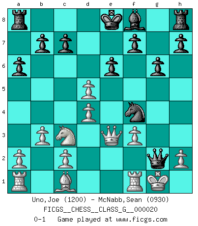 Last move : 0-1 2008 April 25 18:31:38 [Event "FICGS__CHESS__CLASS_G__000020"] [Site "FICGS"] [Date "2008.02.27"] [Round "1"] [White "Uno,Joe"] [Black "McNabb,Sean"] [Result "0-1"] [WhiteElo "1200"] [BlackElo "0930"] 1.b3 d5 2.d4 Nc6 3.e3 Nf6 4.Bd3 Bg4 5.f3 Bh5 6.Ne2 g6 7.O-O a6 8.Nf4 Nb4 9.Nc3 e6 10.Nxh5 Nxh5 11.e4 Nxd3 12.Qxd3 Nf4 13.Qe3 Qg5 14.exd5 Qxg2+ 0-1 Nimzovich-Larsen attack : Classical variation Kingside Castling by player White (move 7) Player Black won this chess game. Follow this game move after move (download)Examine moves that smite! A good eye for smites is far more important than a knowledge of strategical principles. (Purdy) Ich bin es gewohnt, das die Jugend mir überhaupt keinen Respekt entgegenbringt. (Alexander Morozewich) Dejen al perfeccionista jugar por correo. (Yasser Seirawan) Les échecs, c'est l'imagination. (David Bronstein) If computers get too powerful, we can organize them into committees. That'll do them in. (Anonymous)