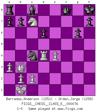 Last move : 1-0 2008 May 26 22:48:0 [Event "FICGS__CHESS__CLASS_E__000076"] [Site "FICGS"] [Date "2008.02.27"] [Round "1"] [White "Barradas,Anderson"] [Black "Orden,Jorge"] [Result "1-0"] [WhiteElo "1251"] [BlackElo "1258"] 1.e4 c5 2.Nf3 d6 3.d4 cxd4 4.Nxd4 Nf6 5.Nc3 e6 6.g4 g6 7.Bg5 Be7 8.Qf3 O-O 9.O-O-O e5 10.Bxf6 Bxf6 11.Nd5 Bg5+ 12.Kb1 exd4 13.h4 Be7 14.h5 Nc6 15.Bc4 Ne5 16.Qb3 Nxg4 17.Rxd4 Nxf2 18.Rf1 Ng4 19.hxg6 fxg6 20.Nxe7+ Kh8 21.Rxf8+ Qxf8 22.Nd5 Ne5 23.Nc7 Nxc4 24.a3 1-0 Sicilian : Scheveningen, Keres attack Kingside Castling by player Black (move 8) Queenside Castling by player White (move 9) Player White won this chess game. Follow this game move after move (download)When asked, -How is that you pick better moves than your opponents?, I responded: I'm very glad you asked me that, because, as it happens, there is a very simple answer. I think up my own moves, and I make my opponent think up his. (Alexander Alekhine) Ich trinke, ich rauche, ich spiele, ich liebe Frauen aber Fernschach ist ein Laster, das ich nicht habe. (Mikhail Nekhemyevich Tal) El Ajedrez es una manera fabulosa para que los niños aprendan a autovalorarse y a autoestimarse. (Saudin Robovic) On a dit que l'homme se distingue de l'animal par le fait qu'il achète plus de livres qu'il ne peut en lire. Je voudrais suggérer qu'inclure à la liste des livres quelques livres d'échecs rendrait la distinction manifeste. (Edward Lasker) The production of too many useful things results in too many useless people. (Karl Marx)