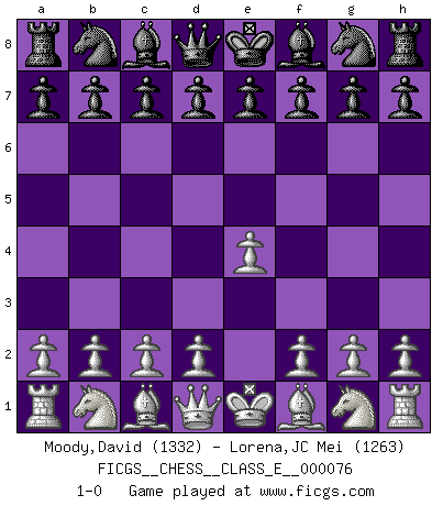 Last move : 1-0 2008 April 9 19:16:55 [Event "FICGS__CHESS__CLASS_E__000076"] [Site "FICGS"] [Date "2008.02.27"] [Round "1"] [White "Moody,David"] [Black "Lorena,JC Mei"] [Result "1-0"] [WhiteElo "1332"] [BlackElo "1263"] 1.e4 1-0 This chess game has been lost on time (started : 2008.02.27 18:33:39) King's pawn Opening Player White won this chess game. Follow this game move after move (download)When asked, -How is that you pick better moves than your opponents?, I responded: I'm very glad you asked me that, because, as it happens, there is a very simple answer. I think up my own moves, and I make my opponent think up his. (Alexander Alekhine) Irgendwie scheint mir sonntags früh um 9 Uhr der Killerinstinkt verloren gegangen zu sein. (Alexej Shirov) Después de la respuesta de las negras a 1.e4 con 1..e5, se quedan siempre tratando de entrar dentro del juego. (Howard Staunton) Tout change constamment, y compris dans le monde des Echecs. (Botvinnik) Strategy without tactics is the slowest route to victory. Tactics without strategy is the noise before defeat. (Sun Tzu)