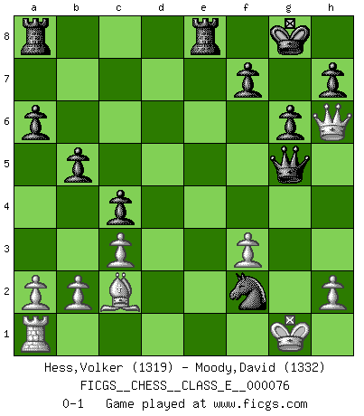 Last move : 0-1 2008 March 4 21:33:5 [Event "FICGS__CHESS__CLASS_E__000076"] [Site "FICGS"] [Date "2008.02.27"] [Round "1"] [White "Hess,Volker"] [Black "Moody,David"] [Result "0-1"] [WhiteElo "1319"] [BlackElo "1332"] 1.e4 e5 2.Nf3 Nc6 3.Bb5 a6 4.Ba4 Nf6 5.O-O Be7 6.Re1 b5 7.Bb3 O-O 8.c3 d5 9.exd5 Nxd5 10.d4 exd4 11.Nxd4 Nxd4 12.Qxd4 Bb7 13.Nd2 Re8 14.Nf3 c5 15.Qg4 Nf6 16.Qf5 g6 17.Qg5 c4 18.Bc2 Bxf3 19.gxf3 Ne4 20.Qh6 Nxf2 21.Rxe7 Qxe7 22.Bg5 Qxg5+ 0-1 Ruy Lopez : Closed, 7...O-O Kingside Castling by player White (move 5) Kingside Castling by player Black (move 7) Player Black won this chess game. Follow this game move after move (download)In the perfect Chess combination as in a first-rate short story, the whole plot and counter-plot should lead up to a striking finale, the interest not being allayed until the very last moment. (Yates and Winter) Ich bewundere Kasparows phantasievolle Angriffssiege aus den Achtzigern und Neunzigern, aber wenn man sie mit dem Computer überprüft, nimmt der Computer in jeder zweiten Partie die Opfer an, verteidigt sich und gewinnt. (Vladimir Kramnik) Repentinamente, me resultaba obvio en mi analisis que yo había pasado por alto lo que Fischer había visto en el tablero con la mas grande facilidad. (Mikhail Botvinnik) Un journaliste : 'Vous préférez avoir une dame de plus sur l'échiquier ou au lit ?' Boris Spassky : 'Ca dépend de la position.' Animated gif is worth one mega-word. (Unknown)