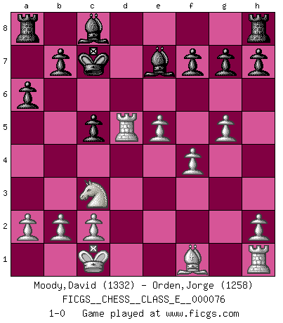 Last move : 1-0 2008 May 27 10:49:12 [Event "FICGS__CHESS__CLASS_E__000076"] [Site "FICGS"] [Date "2008.02.27"] [Round "1"] [White "Moody,David"] [Black "Orden,Jorge"] [Result "1-0"] [WhiteElo "1332"] [BlackElo "1258"] 1.e4 c5 2.Nf3 d6 3.d4 cxd4 4.Nxd4 Nf6 5.Nc3 e6 6.g4 Nc6 7.g5 Nd7 8.Be3 Nc5 9.Qd2 Nxd4 10.Bxd4 e5 11.Bxc5 dxc5 12.Qxd8+ Kxd8 13.O-O-O Kc7 14.Nb5+ Kc6 15.Rd8 a6 16.Nc3 Kc7 17.Re8 Kd7 18.Rxe5 Bd6 19.Rd5 Kc7 20.e5 Be7 21.f4 1-0 Sicilian : Scheveningen, Keres attack Queenside Castling by player White (move 13) Player White won this chess game. Follow this game move after move (download)In Chess, at least, the brave inherit the earth. (Edmar Mednis) Ein bischen Romantik kann weder im Schach noch in der Liebe schaden. Also versuche ich mich ab und zu daran zu erinnern. (Nigel Short) Los Peones son nacidos libres, y aún así, se encuentran encadenados por todos lados. (Rick Kennedy) Donnez-moi un Cavalier en 6e et je gagnerais toutes mes parties. (Steinitz) Nobody is always a winner, and anybody who says he is, is either a liar or doesn't play poker. (Amarillo Slim)
