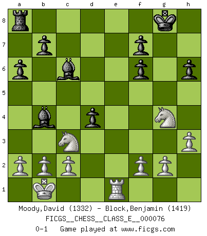 Last move : 0-1 2008 March 9 20:22:56 [Event "FICGS__CHESS__CLASS_E__000076"] [Site "FICGS"] [Date "2008.02.27"] [Round "1"] [White "Moody,David"] [Black "Block,Benjamin"] [Result "0-1"] [WhiteElo "1332"] [BlackElo "1419"] 1.e4 c5 2.Nf3 d6 3.d4 cxd4 4.Qxd4 Nc6 5.Bb5 Bd7 6.Bxc6 Bxc6 7.Nc3 Nf6 8.Bg5 e6 9.O-O-O Be7 10.Rhe1 O-O 11.Kb1 h6 12.Bh4 Re8 13.h3 a6 14.Bg3 d5 15.Ne5 Qa5 16.exd5 exd5 17.Bh4 Bc5 18.Qf4 Qb4 19.Qxb4 Bxb4 20.Bxf6 gxf6 21.Ng4 Rxe1 22.Rxe1 d4 0-1 Sicilian, Chekhover variation Queenside Castling by player White (move 9) Kingside Castling by player Black (move 10) Player Black won this chess game. Follow this game move after move (download)No Chess Grandmaster is normal; they only differ in the extent of their madness. (Viktor Korchnoi) Kostenjuk hat keinen Sexappeal. (Loek van Wely) El Ajedrez es realmente noventa y nueve por ciento calculación. (Soltis) On croit qu'il y a plus de mauvais joueurs que de bons joueurs, c'est faux : Il y a autant de joueurs qui gagnent que de joueurs qui perdent. (Philippe Geluck) Wawaweewa ! (Borat: Cultural learnings of America for make benefit glorious nation of Kazakhstan)