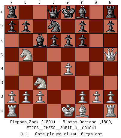 Last move : 0-1 2008 May 11 21:33:31 [Event "FICGS__CHESS__RAPID_A__000041"] [Site "FICGS"] [Date "2008.02.28"] [Round "1"] [White "Stephen,Zack"] [Black "Biason,Adriano"] [Result "0-1"] [WhiteElo "1800"] [BlackElo "1800"] 1.e4 c5 2.Nf3 d6 3.d4 cxd4 4.Nxd4 Nf6 5.Nc3 Bd7 6.Bg5 e6 7.Ndb5 Bc6 8.Bxf6 gxf6 9.Qh5 Nd7 0-1 This chess game has been lost on time (started : 2008.02.28 2:26:25) Sicilian Player Black won this chess game. Follow this game move after move (download)One of these modest little moves may be more embarrassing to your opponent than the biggest threat. (Siegbert Tarrasch) Schach ist mein Leben, meine Leidenschaft, was ich gelernt habe und seit meinem 14. Lebensjahr profimässig praktiziere. Darauf zu verzichten, würde mir sehr schwer fallen. (Viktor Kortschnoi) El Ajedrez es la vida. (Bobby Fischer) On a dit que l'homme se distingue de l'animal par le fait qu'il achète plus de livres qu'il ne peut en lire. Je voudrais suggérer qu'inclure à la liste des livres quelques livres d'échecs rendrait la distinction manifeste. (Edward Lasker) CHESS, n. f. [echecs, Fr.] A nice and abstruse game, in which two sets of puppets are moved in opposition to each other. (Dr Samuel Johnson, A Dictionary Of The English Language, 1755)