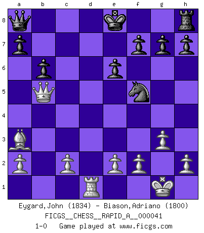 Last move : 1-0 2008 May 16 8:34:43 [Event "FICGS__CHESS__RAPID_A__000041"] [Site "FICGS"] [Date "2008.02.28"] [Round "1"] [White "Eygard,John"] [Black "Biason,Adriano"] [Result "1-0"] [WhiteElo "1834"] [BlackElo "1800"] 1.d4 Nf6 2.Nf3 e6 3.Nc3 Bb4 4.g3 Ne4 5.Qd3 d5 6.Bg2 Bxc3+ 7.bxc3 b6 8.c4 Ba6 9.Qe3 Bxc4 10.Ne5 Nd6 11.Ba3 Nf5 12.Qf4 Nd7 13.Nxc4 dxc4 14.Bxa8 Qxa8 15.O-O Qc6 16.d5 Qxd5 17.Qxc7 Qa8 18.Rad1 Qd8 19.Qxc4 Qa8 20.Rxd7 Kxd7 21.Rd1+ Ke8 22.Qb5+ 1-0 Queen's pawn game Kingside Castling by player White (move 15) Player White won this chess game. Follow this game move after move (download)No other master has such a terrific will to win. At the board he radiates danger, and even the strongest opponents tend to freeze, like rabbits when they smell a panther. Even his weaknesses are dangerous. As white, his opening game is predictable - you can make plans against it - but so strong that your plans almost never work. In the middle game his precision and invention are fabulous, and in the end game you simply cannot beat him. (Anonymous German Expert) Frage des Reporters: -Welche besonderen Umstände rechtfertigen das Anhalten der Uhren während einer Turnierpartie? Antwort: -Einen Fotographen zu strangulieren. (Siegbert Tarrasch) Cada Peón es una Reina en potencia. (James Mason) Comme les marins qui ont mille raisons différentes d'aller en mer, les joueurs d'échecs en ont tout autant avant de s'installer devant une table et jouer... (Vincent Bertignac, philosophe) The problem with manipulation is that people can turn on you. (Horatio Caine, C.S.I. Miami)