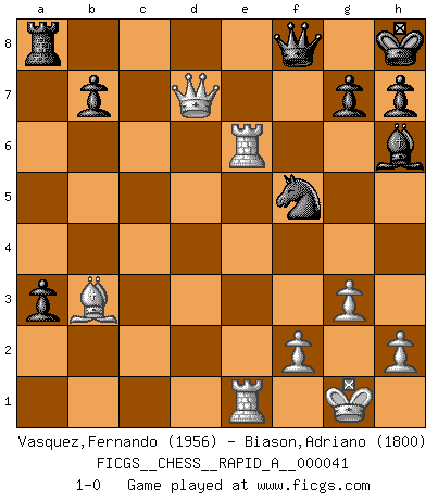 Last move : 1-0 2008 May 22 7:15:7 [Event "FICGS__CHESS__RAPID_A__000041"] [Site "FICGS"] [Date "2008.02.28"] [Round "1"] [White "Vasquez,Fernando"] [Black "Biason,Adriano"] [Result "1-0"] [WhiteElo "1956"] [BlackElo "1800"] 1.e4 c5 2.d4 cxd4 3.c3 dxc3 4.Nxc3 e6 5.Nf3 Bc5 6.Bc4 Ne7 7.O-O O-O 8.Na4 Bb4 9.a3 Ba5 10.b4 Bc7 11.Bb2 a6 12.Bb3 Nbc6 13.Rc1 Bf4 14.Rc2 d6 15.Nc3 f5 16.Re1 fxe4 17.Nxe4 d5 18.Nc5 Qd6 19.g3 Bh6 20.Ne5 Nxe5 21.Bxe5 Qd8 22.Rce2 a5 23.Bd4 axb4 24.Nxe6 Bxe6 25.Rxe6 Nf5 26.Bc5 Kh8 27.Bxf8 Qxf8 28.Qxd5 bxa3 29.Qd7 1-0 Sicilian : Smith-Morra gambit Kingside Castling by player White (move 7) Kingside Castling by player Black (move 7) Player White won this chess game. Follow this game move after move (download)You are for me the Queen on d8 and I am the Pawn on d7 !! (Eduard Gufeld) Ich hatte Zahnschmerzen im ersten Spiel. In der zweiten Partie tat mir der Kopf weh. In der dritten war es eine Rheuma-Attacke und während der vierten fühlte ich mich nicht gut. Und in der fünften? Nun, man muss doch nicht jedes Spiel gewinnen, oder? (Savielly Grigorievitsch Tartakower) El Ajedrez es un expediente tonto que hace creer a la gente inactiva que hacen una cosa muy astuta cuando solamente estan perdiendo su tiempo. (George Bernard Shaw) Si je n'étais pas joueur d'échecs, je serais le meilleur dans quelque chose d'autre. (Anatoli Karpov) Looking at the proliferation of personal web pages on the Net, it looks like very soon everyone on Earth will have 15 megabytes of fame. (M.G. Sriram)