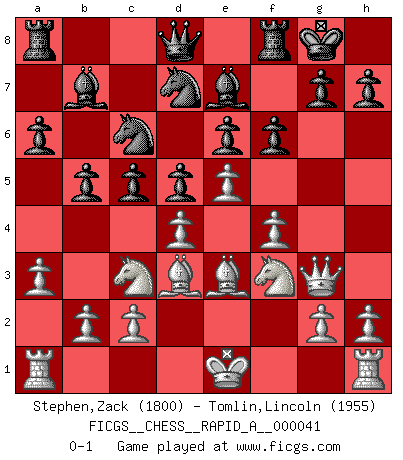 Last move : 0-1 2008 May 8 9:26:32 [Event "FICGS__CHESS__RAPID_A__000041"] [Site "FICGS"] [Date "2008.02.28"] [Round "1"] [White "Stephen,Zack"] [Black "Tomlin,Lincoln"] [Result "0-1"] [WhiteElo "1800"] [BlackElo "1955"] 1.e4 e6 2.d4 d5 3.Nc3 Nf6 4.e5 Nfd7 5.f4 c5 6.Nf3 Nc6 7.Be3 a6 8.Qd2 b5 9.a3 Bb7 10.Bd3 Be7 11.Qf2 f6 12.Qg3 O-O 0-1 This chess game has been lost on time (started : 2008.02.28 2:26:25) French : Steinitz, Boleslavsky variation Kingside Castling by player Black (move 12) Player Black won this chess game. Follow this game move after move (download)A big shock; the best chess player in history has passed away. (Lajos Portisch, about Bobby Fischer's death) Aljechin war kein Nazi. Er war ein Opportunist. Ein schrecklicher Mann. Er liebte Geld über alles und würde für Geld ein Jude, ein Katolik oder ein Protestant werden. (Miguel Najdorf) La maestría del Ajedrez consiste esencialmente en analizar posiciónes de Ajedrez con precisión. (Mikhail Botvinnik) La tactique, c'est ce que vous faites quand il y a quelque chose à faire; la stratégie, c'est ce que vous faites quand il n'y a rien à faire. (Savielli Tartacower) The smarter you play, the luckier you'll be. (Mark Pilarski)