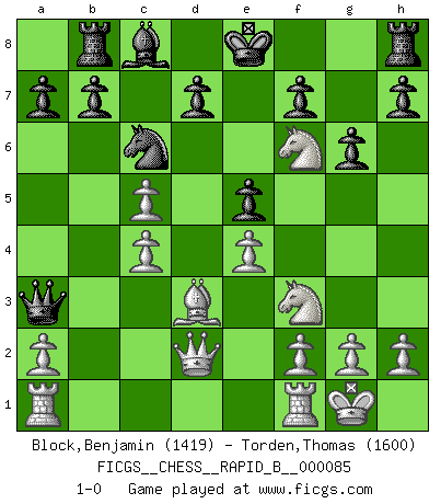 Last move : 1-0 2008 March 10 5:8:19 [Event "FICGS__CHESS__RAPID_B__000085"] [Site "FICGS"] [Date "2008.02.28"] [Round "1"] [White "Block,Benjamin"] [Black "Torden,Thomas"] [Result "1-0"] [WhiteElo "1419"] [BlackElo "1600"] 1.e4 c5 2.Nf3 g6 3.d4 Bg7 4.c4 Qa5+ 5.Bd2 Qb6 6.Bc3 Nc6 7.dxc5 Bxc3+ 8.Nxc3 Qxb2 9.Nd5 Rb8 10.Bd3 Nf6 11.O-O Qa3 12.Qd2 e5 13.Nxf6+ 1-0 Sicilian : Hungarian variation Kingside Castling by player White (move 11) Player White won this chess game. Follow this game move after move (download)Chess is war over the board. The object is to crush the opponents mind. (Bobby Fischer) Ohne Leiden bildet sich kein Charakter. (Ernst Freiherr von Feuchtersleben) Nunca antes ha habido un jugador de Ajedrez con tal conocimiento a fondo de las complejidades del juego y una inmensa voluntad absolutamente indomable de ganar. Yo pienso que Fischer es el jugador mas grande que jamás haya existido. (Lisa Lane) En blitz, le Cavalier l'emporte sur le Fou. (Vlastimil Hort) Do not put your faith in what statistics say until you have carefully considered what they do not say. (William W. Watt)
