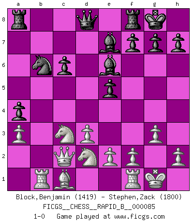 Last move : 1-0 2008 May 16 22:6:16 [Event "FICGS__CHESS__RAPID_B__000085"] [Site "FICGS"] [Date "2008.02.28"] [Round "1"] [White "Block,Benjamin"] [Black "Stephen,Zack"] [Result "1-0"] [WhiteElo "1419"] [BlackElo "1800"] 1.c4 e5 2.Nc3 Nf6 3.g3 d5 4.cxd5 Nxd5 5.Bg2 Nb6 6.Nf3 Nc6 7.O-O Be7 8.a3 O-O 9.b4 Be6 10.d3 a5 11.b5 Nd4 12.Nd2 c6 13.bxc6 Nxc6 14.Rb1 a4 15.Bxc6 bxc6 16.Qc2 1-0 This chess game has been lost on time (started : 2008.02.28 10:52:58) English : Bremen, reverse Dragon Kingside Castling by player White (move 7) Kingside Castling by player Black (move 8) Player White won this chess game. Follow this game move after move (download)Life is like a game of Chess, changing with each move. (Chinese proverb) Computer sind die einzigen Gegner, die nicht immer eine Ausrede auf Lager haben, wenn sie gegen mich verlieren. (Robert James Fischer) El Ajedrez, como la música, como el amor, tiene el poder de hacer feliz a la gente. (Siegbert Tarrasch) Les échecs sont un jeu terrible. Si vous n'avez pas le centre, votre adversaire a une position plus libre. Par contre, si vous avez le centre, alors vous avez vraiment quelque chose pour laquelle vous inquiéter ! (Siegbert Tarrasch) Wikichess, chess moves explained by 'experimented' players. (Thibault de Vassal)