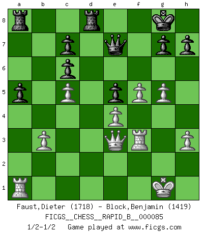 Last move : 1/2-1/2 2008 March 24 12:50:55 [Event "FICGS__CHESS__RAPID_B__000085"] [Site "FICGS"] [Date "2008.02.28"] [Round "1"] [White "Faust,Dieter"] [Black "Block,Benjamin"] [Result "1/2-1/2"] [WhiteElo "1718"] [BlackElo "1419"] 1.e4 e5 2.Nf3 Nc6 3.Bb5 a6 4.Bxc6 dxc6 5.O-O Bd6 6.d4 exd4 7.Qxd4 f6 8.Be3 Ne7 9.Nbd2 Be6 10.b3 b5 11.Qb2 O-O 12.c4 Ng6 13.Nd4 Qe7 14.c5 Be5 15.f4 Bxd4 16.Bxd4 Bf7 17.f5 Ne5 18.Bxe5 fxe5 19.Qc3 Bh5 20.h3 Rfe8 21.g4 Bf7 22.Qe3 Red8 23.Nf3 b4 24.g5 Bh5 25.a3 bxa3 26.Rxa3 a5 27.R3a1 Bxf3 28.Rxf3 1/2-1/2 Ruy Lopez : Exchange variation, 5.O-O Kingside Castling by player White (move 5) Kingside Castling by player Black (move 11) This chess game ended in a draw. Follow this game move after move (download)A bad day of Chess is better than any good day at work. (Anonymous) Es gibt Leute, die glauben, alles wäre vernünftig, was man mit einem ernsthaften Gesicht tut. (Georg Christoph Lichtenberg) ¿Quién es tu oponente esta tarde? Esta tarde mi oponente son las piezas negras. (Akiba Rubinstein) J'apprécie les joueurs d'est-indienne, c'est grâce à eux que je nourris ma famille depuis tant d'années. (Petrosian) The ego is not master in its own house. (Sigmund Freud)
