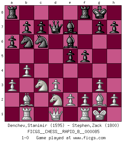 Last move : 1-0 2008 May 17 22:9:27 [Event "FICGS__CHESS__RAPID_B__000085"] [Site "FICGS"] [Date "2008.02.28"] [Round "1"] [White "Denchev,Stanimir"] [Black "Stephen,Zack"] [Result "1-0"] [WhiteElo "1595"] [BlackElo "1800"] 1.c4 e5 2.Nc3 Nf6 3.g3 d5 4.cxd5 Nxd5 5.Bg2 Nb6 6.Nf3 Nc6 7.Rb1 Be7 8.b4 a6 9.O-O O-O 10.a3 Be6 11.d3 f5 12.Bb2 Qd7 13.Nd2 1-0 This chess game has been lost on time (started : 2008.02.28 10:52:58) English : Bremen, reverse Dragon Kingside Castling by player White (move 9) Kingside Castling by player Black (move 9) Player White won this chess game. Follow this game move after move (download)Best by test: 1. e4 (Bobby Fischer) Was ist der Unterschied zwischen einem Strassenarbeiter und einem Schachspieler? --Der Schachspieler bewegt sich ab und zu. (Anonymous) Botvinnik trató de alejar el misterio referente al Ajedrez, siempre relacionandolo a situaciones de la vida diaria. Solía llamar al Ajedrez un problema inexacto típico, similar a aquellos en que la gente tiene siempre que resolver a cada día. (Garry Kasparov) Un journaliste : 'Vous préférez avoir une dame de plus sur l'échiquier ou au lit ?' Boris Spassky : 'Ca dépend de la position.' All the biggest technological inventions created by man - the airplane, the automobile, the computer - says little about his intelligence, but speaks volumes about his laziness. (Mark Kennedy)
