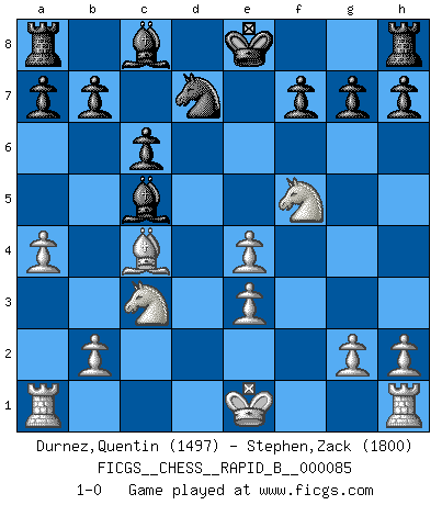 Last move : 1-0 2008 May 16 22:6:16 [Event "FICGS__CHESS__RAPID_B__000085"] [Site "FICGS"] [Date "2008.02.28"] [Round "1"] [White "Durnez,Quentin"] [Black "Stephen,Zack"] [Result "1-0"] [WhiteElo "1497"] [BlackElo "1800"] 1.d4 d5 2.c4 c6 3.Nc3 dxc4 4.a4 e5 5.Nf3 exd4 6.Qxd4 Qxd4 7.Nxd4 Nd7 8.e4 Bc5 9.Be3 Ngf6 10.Bxc4 Ng4 11.Nf5 Nxe3 12.fxe3 1-0 This chess game has been lost on time (started : 2008.02.28 10:52:58) QGD Slav defense Player White won this chess game. Follow this game move after move (download)Pawn endings are to Chess what putting is to golf. (Cecil Purdy) Über Frauen: Chess is better. (Robert James Fischer) Un entendimiento a fondo de las continuaciones típicas del mate, hace de las combinaciones de sacrificio mas complicadas conducirlas a ellas no solo sin dificultad, sino casi de una manera natural. (Siegbert Tarrasch) Il (Jacob Murray) ne joue pas pour le bon coup, mais pour le meilleur. (Eloi Relange) We need strong personalities and only one world champion to attract sponsors. (Anatoly Karpov)