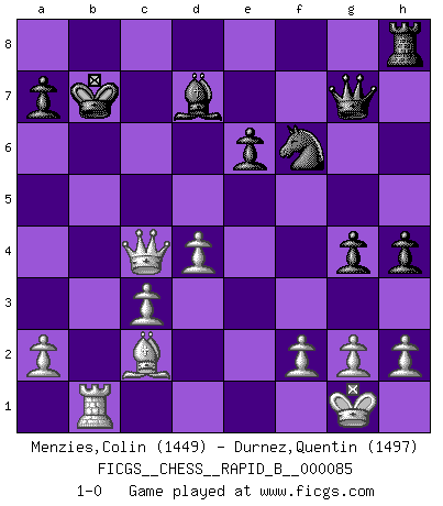 Last move : 1-0 2008 April 14 11:16:41 [Event "FICGS__CHESS__RAPID_B__000085"] [Site "FICGS"] [Date "2008.02.28"] [Round "1"] [White "Menzies,Colin"] [Black "Durnez,Quentin"] [Result "1-0"] [WhiteElo "1449"] [BlackElo "1497"] 1.d4 d5 2.Nf3 Nf6 3.Bg5 e6 4.Nbd2 Nbd7 5.e3 Be7 6.Bd3 h6 7.Bh4 c5 8.c3 c4 9.Bc2 Nb6 10.e4 Bd7 11.e5 Nh7 12.Bxe7 Qxe7 13.O-O f5 14.exf6 Nxf6 15.Ne5 O-O-O 16.Ng6 Qf7 17.Nxh8 Rxh8 18.Nf3 g5 19.Ne5 Qg7 20.b3 h5 21.bxc4 Nxc4 22.Nxc4 dxc4 23.Qe2 g4 24.Qxc4+ Kb8 25.Rab1 h4 26.Rxb7+ Kxb7 27.Rb1+ 1-0 Torre attack (Tartakower variation) Kingside Castling by player White (move 13) Queenside Castling by player Black (move 15) Player White won this chess game. Follow this game move after move (download)Fischer sacrificed virtually everything most of us weakies (to use his term) value, respect, and cherish, for the sake of an artful, often beautiful board game, for the ambivalent privilege of being its greatest master. (Paul Kollar) Gewöhnliche Menschen denken nur daran, wie sie ihre Zeit verbringen. Ein intelligenter Mensch versucht, sie auszunutzen. (Arthur Schopenhauer) Hoy en día, si tu no eres un Gran Maestro a los 14 años, es mejor que lo olvides. (Anand Viswanathan) On croit qu'il y a plus de mauvais joueurs que de bons joueurs, c'est faux : Il y a autant de joueurs qui gagnent que de joueurs qui perdent. (Philippe Geluck) Opportunities multiply as they are seized. (Sun Tzu)