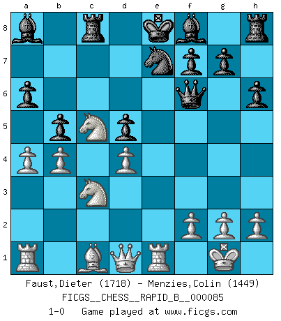 Last move : 1-0 2008 March 23 2:54:10 [Event "FICGS__CHESS__RAPID_B__000085"] [Site "FICGS"] [Date "2008.02.28"] [Round "1"] [White "Faust,Dieter"] [Black "Menzies,Colin"] [Result "1-0"] [WhiteElo "1718"] [BlackElo "1449"] 1.e4 c5 2.c3 b6 3.Nf3 Bb7 4.Bc4 e6 5.d3 d5 6.exd5 exd5 7.Bb5+ Nc6 8.Qe2+ Nge7 9.O-O a6 10.Bxc6+ Bxc6 11.Re1 Qd6 12.Ne5 Bb7 13.d4 cxd4 14.cxd4 Qe6 15.Qd1 Rc8 16.Nc3 b5 17.Nd3 Qf6 18.Nc5 Ba8 19.b4 h6 20.a4 1-0 Sicilian : Alapin's variation (2.c3) Kingside Castling by player White (move 9) Player White won this chess game. Follow this game move after move (download)It is not a move, even the best move that you must seek, but a realizable plan. (Eugene Znosko-Borovsky) Jeder Schachmeister war einmal ein Anfänger. (Irving Chernev) Una buena ofensiva y una buena defensa, comienzan ambas con un buen desarrollo. (Bruce A. Moon) J'ai vu le vaincu d'Echecs jouer des années durant dans l'espoir de la fête de la victoire. Car tu es plus riche de ce qu'elle existe si même elle n'est point pour toi. Ainsi de la perle du fond des mers. (Antoine de Saint-Exupéry) Mandala - that's it! 16x16 squares as multiple of the four and the eight because of the Four Noble Truths and the Noble Eightfold Path. (Heinz-Georg Lehnhoff about Big Chess)