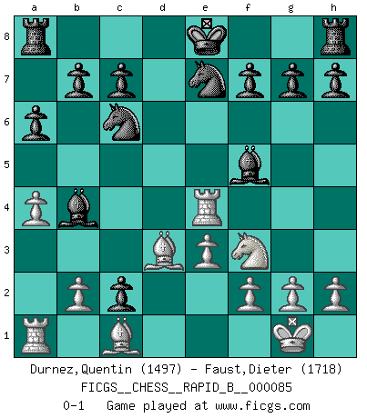 Last move : 0-1 2008 March 19 9:22:50 [Event "FICGS__CHESS__RAPID_B__000085"] [Site "FICGS"] [Date "2008.02.28"] [Round "1"] [White "Durnez,Quentin"] [Black "Faust,Dieter"] [Result "0-1"] [WhiteElo "1497"] [BlackElo "1718"] 1.d4 d5 2.c4 dxc4 3.Nc3 a6 4.a4 Nc6 5.e3 e5 6.Nf3 exd4 7.Bxc4 dxc3 8.Qxd8+ Nxd8 9.O-O Bb4 10.Rd1 c2 11.Rd4 Nc6 12.Re4+ Nge7 13.Bd3 Bf5 0-1 Queen's gambit accepted Kingside Castling by player White (move 9) Player Black won this chess game. Follow this game move after move (download)When asked, -How is that you pick better moves than your opponents?, I responded: I'm very glad you asked me that, because, as it happens, there is a very simple answer. I think up my own moves, and I make my opponent think up his. (Alexander Alekhine) Wenn Dein Gegner dir ein Remis anbietet, versuch herauszufinden, weshalb er glaubt schlechter zu stehen. (Nigel Short) El sobresalir en el Ajedrez es un signo de una mente intrigante. (Sir Arthur Conan Doyle) On a dit que l'homme se distingue de l'animal par le fait qu'il achète plus de livres qu'il ne peut en lire. Je voudrais suggérer qu'inclure à la liste des livres quelques livres d'échecs rendrait la distinction manifeste. (Edward Lasker) If passion drives you, let reason holds the reins. (Benjamin Franklin)