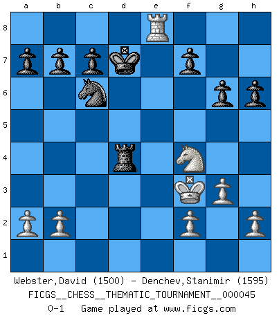 Last move : 0-1 2008 June 17 12:35:42 [Event "FICGS__CHESS__THEMATIC_TOURNAMENT__000045"] [Site "FICGS"] [Date "2008.02.28"] [Round "1"] [White "Webster,David"] [Black "Denchev,Stanimir"] [Result "0-1"] [WhiteElo "1500"] [BlackElo "1595"] 1.e4 d5 2.exd5 Nf6 3.c4 e6 4.dxe6 Bxe6 5.Nf3 Nc6 6.d4 Bb4+ 7.Nc3 Qe7 8.Be2 Bxc4 9.Bd2 O-O-O 10.O-O Bxe2 11.Nxe2 Bxd2 12.Qxd2 Rhe8 13.Rfe1 Qd6 14.Ng5 Ng4 15.Qf4 Qxf4 16.Nxf4 Rxe1+ 17.Rxe1 Rxd4 18.g3 Nge5 19.Kg2 h6 20.Nf3 Nxf3 21.Kxf3 g6 22.Re8+ Kd7 0-1 Scandinavian : Icelandic gambit Queenside Castling by player Black (move 9) Kingside Castling by player White (move 10) Player Black won this chess game. Follow this game move after move (download)The passed pawn is a criminal, who should be kept under lock and key. Mild measures, such as police surveillance, are not sufficient. (Nimzovitch) Offensichtlich kennt Kasparow nichts anderes als Schach, und ich könnte 500 weitere Spieler dieser Sorte benennen. (Judith Polgar) Los asuntos humanos son como una partida de Ajedrez: solo aquellos que no lo toman seriamente, pueden ser llamados buenos jugadores. (Hung Tzu Ch'eng) Mon pion favori sur ma case favorite ! Bronstein en parlant d'un coup de pion en h5 quand il avait les Noirs. When I took office, only high energy physicists had ever heard of what is called the World Wide Web... Now even my cat has its own page. (Bill Clinton, 1996)