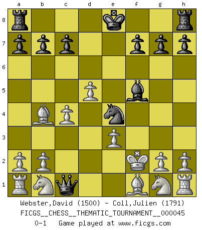 Last move : 0-1 2008 July 11 14:49:0 [Event "FICGS__CHESS__THEMATIC_TOURNAMENT__000045"] [Site "FICGS"] [Date "2008.02.28"] [Round "1"] [White "Webster,David"] [Black "Coll,Julien"] [Result "0-1"] [WhiteElo "1500"] [BlackElo "1791"] 1.e4 d5 2.exd5 Nf6 3.c4 e6 4.dxe6 Bxe6 5.d4 Bb4+ 6.Bd2 Qe7 7.Qe2 Nc6 8.d5 Nd4 9.Qd3 Bf5 10.Qe3 Nc2+ 11.Kd1 Nxe3+ 12.fxe3 Qe4 13.Bxb4 Qc2+ 14.Ke1 Qc1+ 15.Kf2 Ne4+ 0-1 Scandinavian : Icelandic gambit Player Black won this chess game. Follow this game move after move (download)Half the variations which are calculated in a tournament game turn out to be completely superfluous. Unfortunately, no one knows in advance which half. (Jan Tinman) Über Karpov: Er war und ist ein Vertreter der russischen Reaktionäre. Das steckt tief in seiner Seele, wehalb ich nicht nett mit ihm umgehen kann. (Viktor Kortschnoi) Por tratar de evitar la pérdida de una pieza, muchas personas han perdido una partida de Ajedrez. (Savielly Tartakover) Les échecs sont un jeu par leur forme, un art par leur essence et une science par sa difficulté d'acquisition. Ils peuvent vous procurer autant de plaisir qu'un bon livre ou une belle musique, mais vous n'aurez une réelle joie que si vous arrivez à bien jouer. (Tigran Petrosian) The only thing that matters is the evidence. (Horatio Caine, C.S.I. Miami)